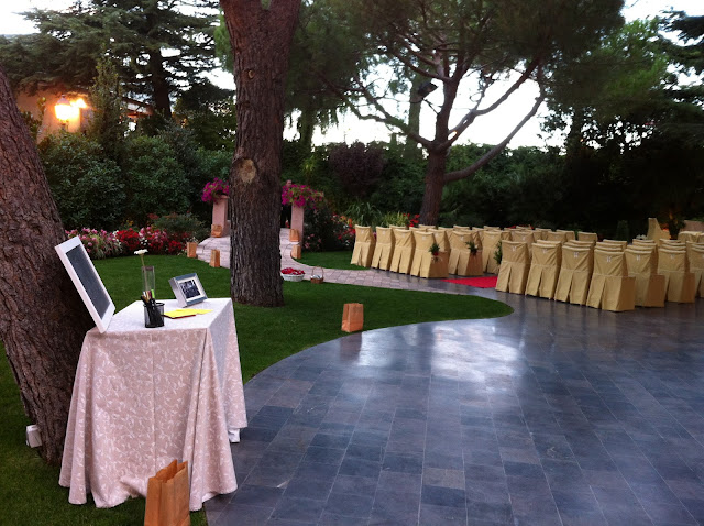 Según fueron llegando los invitados se les repartió un tarjetón dándoles la bienvenida de parte de los novios. Cuando la ceremonia civil estaba acabando se repartieron pétalos a todos los presentes, y también unos pomperos muy graciosos con forma de botellas de cava que causaron sensación.