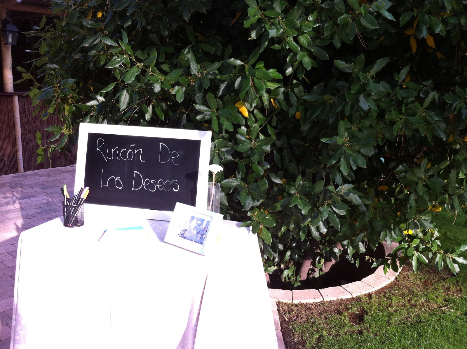 La zona del cocktail estaba al lado de la de la ceremonia, y en ella colocamos un “Rincón de los Deseos”, que posteriormente desplazamos a la barra libre para que los invitados que aún no hubieran dejado su dedicatoria a los recién casados tuvieran su oportunidad de hacerlo.