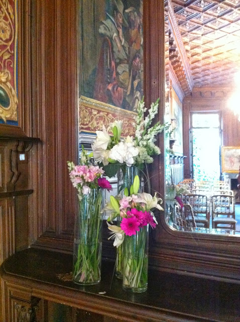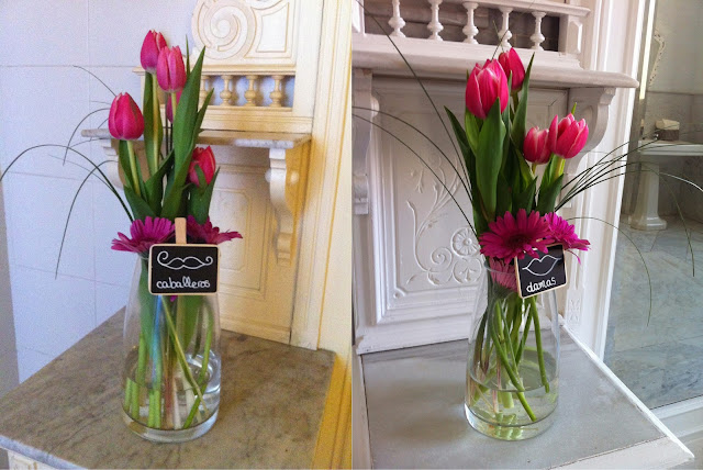 Los baños del Jardín de Gomérez eran igual de bonitos que el resto de la casa, así que no pudimos por menos que dedicarles un poquito de atención y colocar varios centros de flor para decorarlos.