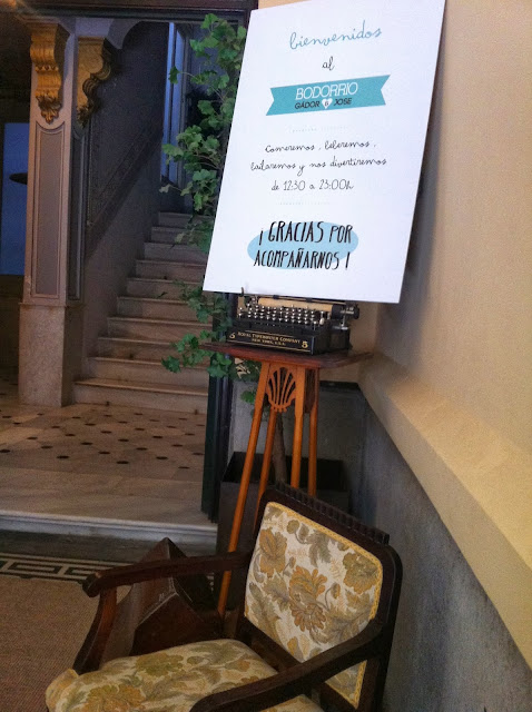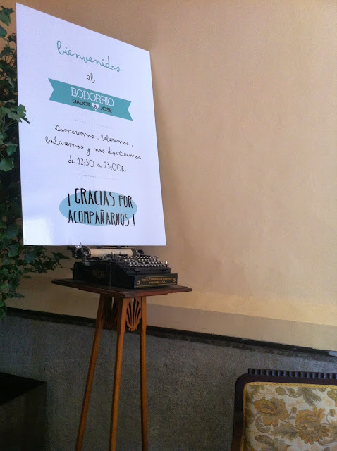El diseño gráfico del evento lo ha realizado Bonitismos, y la verdad es que todo lo que han hecho para esta boda ha quedado insuperable. Para la entrada de los invitados imprimimos este cartel de bienvenida, que colocamos en un rincón decorado con un sillón y una máquina de escribir antigua; anticipando el estilo que encontrarían en el resto de la celebración.