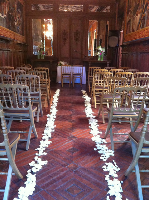 El suelo del salón era precioso, así que decidimos marcar el pasillo con pétalos blancos a los lados, y prescindir de una alfombra. Hay ocasiones en que menos es más.
