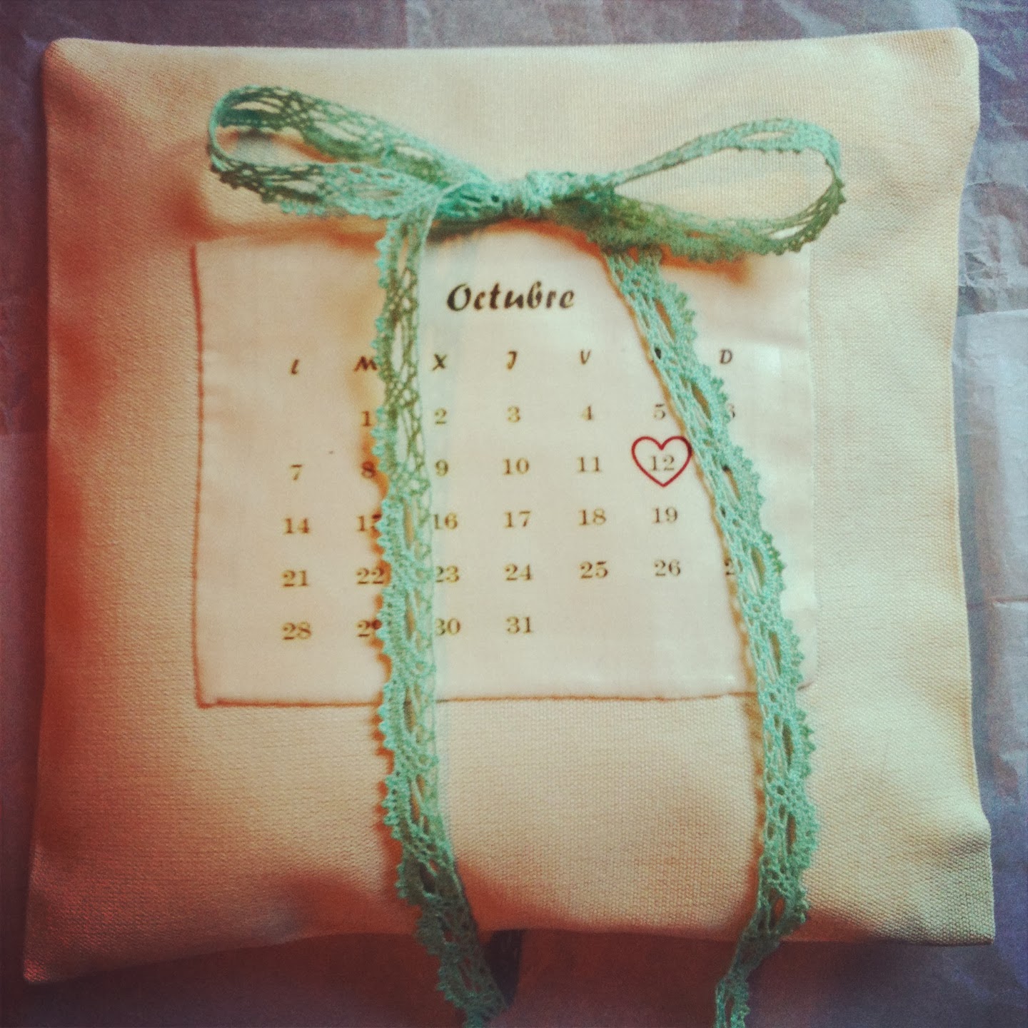 La novia entró a la ceremonia con un cortejo de 6 niños, y una de las damitas llevó este cojín tan original que Gádor tenía claro que quería desde que nos vimos la primera vez; con un calendario impreso en tela en el que estaba señalado el día de la boda, y que en Something Blue hicimos con todo nuestro cariño utilizando para el lazo un encaje en color mint (el color predominante en esta boda).