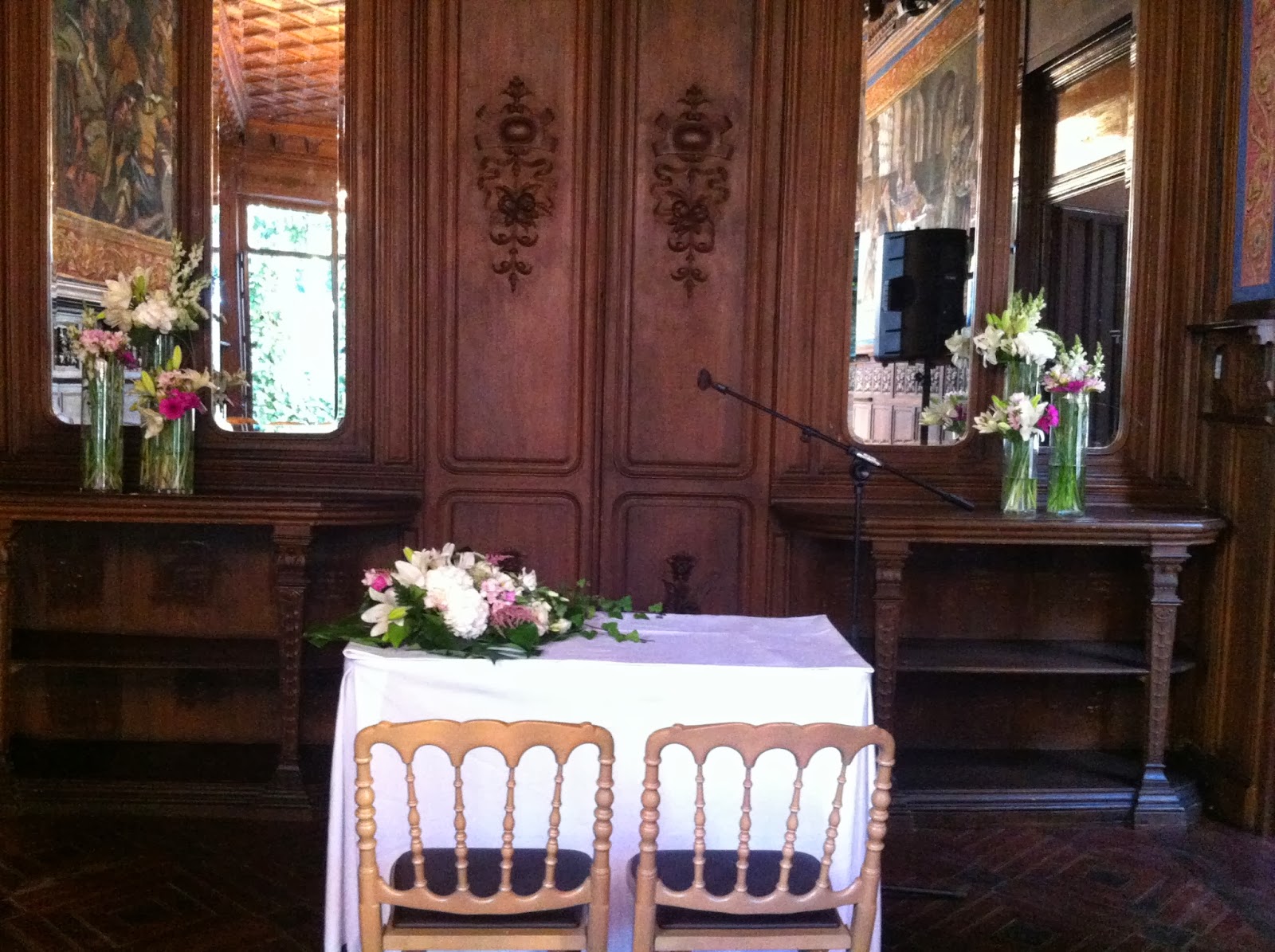 Para la ceremonia, dado que el salón estaba ya bastante recargado, optamos por una decoración sencilla, en la que tenían mucha importancia las sillas modelo Napoleón. Solicitamos a Miguel Angel Salazar (el florista que ha trabajado con nosotros en este bodorrio) un centro para la mesa del oficiante, y tres volúmenes en vidrio para colocar a cada lado de la misma. Todo ello con flores en tonos blancos, cremas y rosas; le facilitamos imágenes de las que partir, y la memoria de flor que queríamos utilizar. El resultado fue simplemente perfecto.