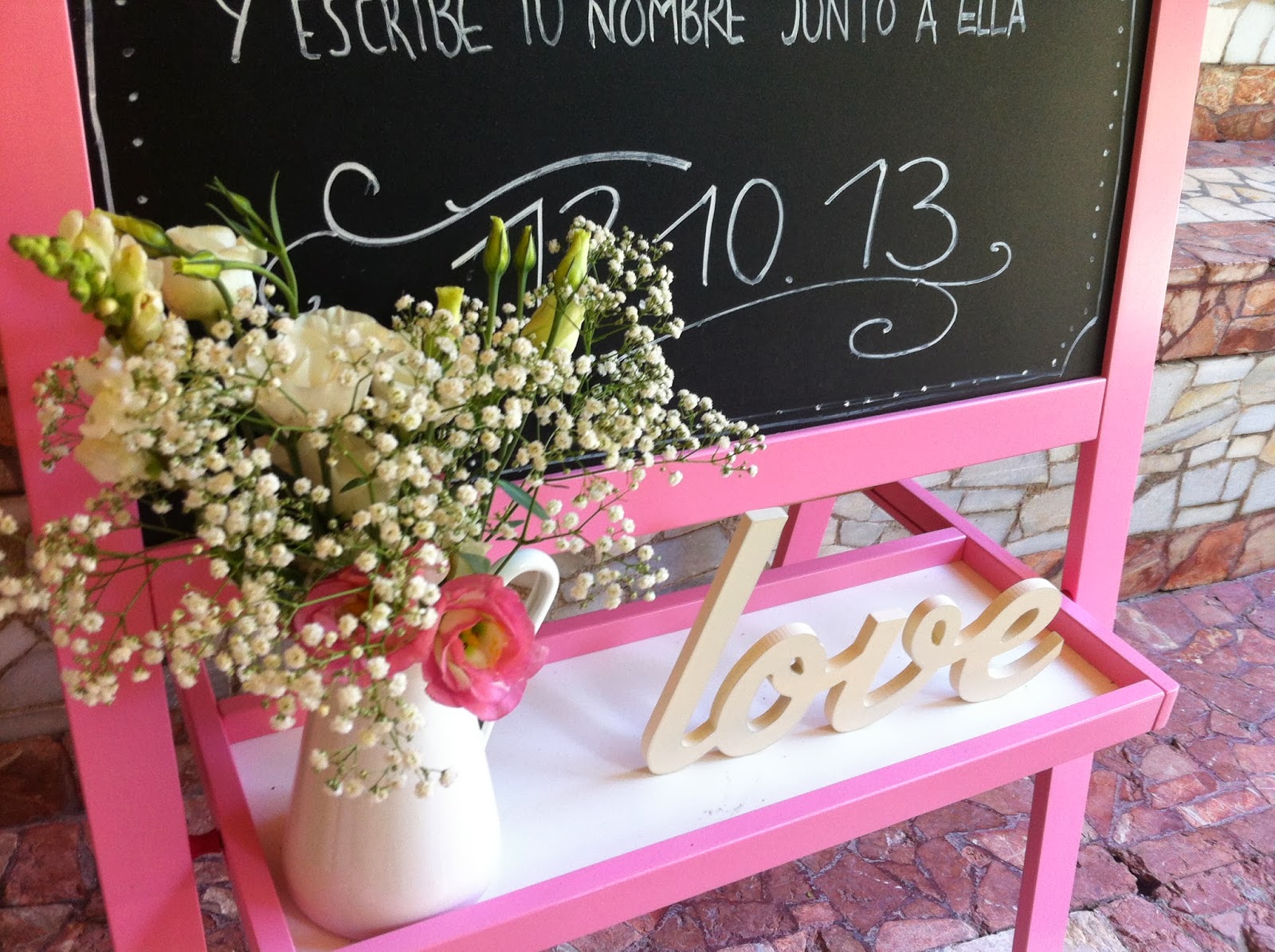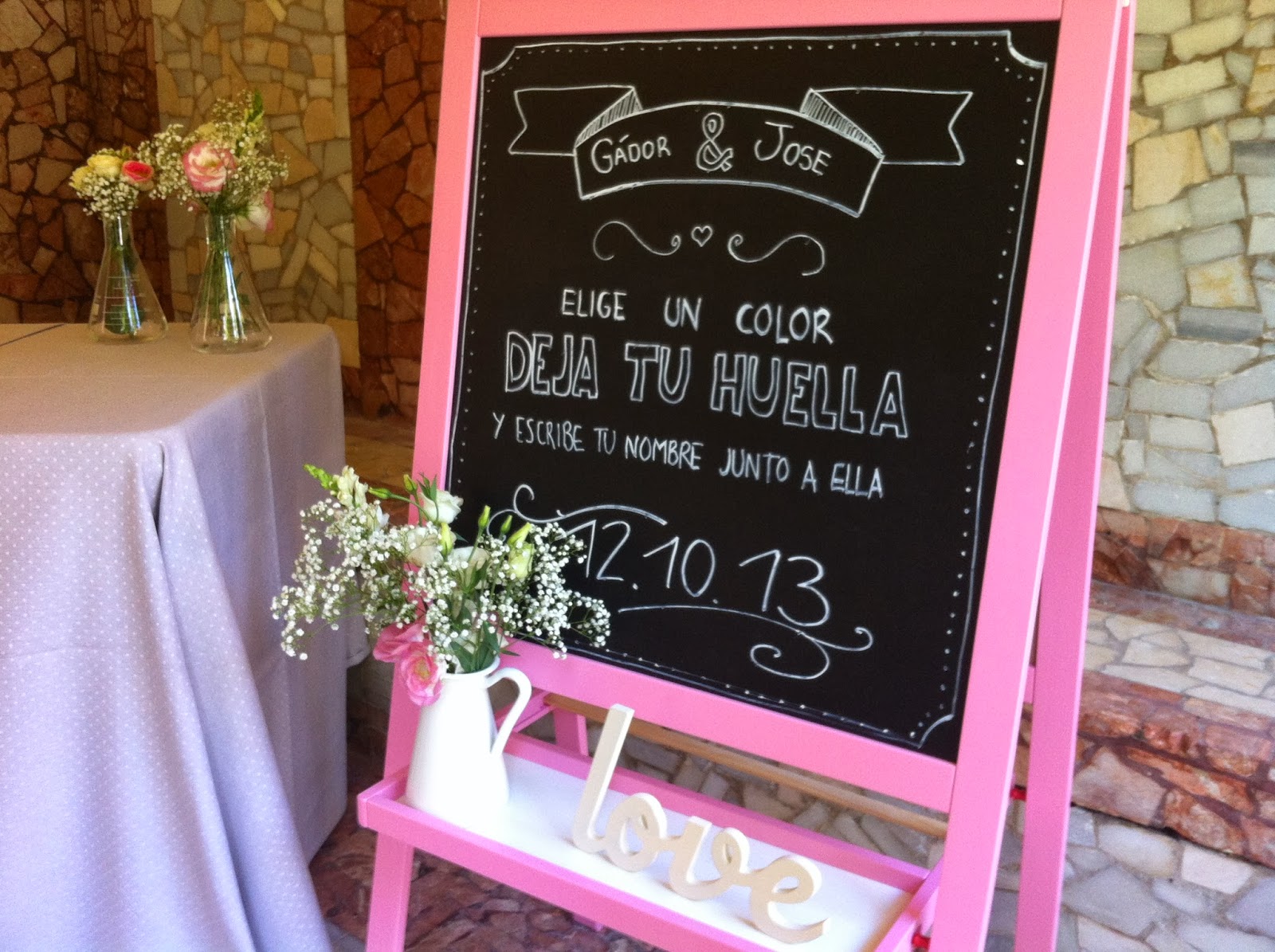 Los novios también tenían claro que querían montar algún punto en el cocktail donde colocar un árbol de huellas, al final en lugar de un árbol Bonitismos le dio una vuelta a la idea y realizó un cartelón con una bici muy chula. Además del diseño donde poner las huellas y los tampones de colores para hacerlo, había que mostrar las instrucciones para que cada invitado dejara su recuerdo a los invitados, y para ello utilizamos una pizarra en color rosa al lado de la mesa. Todo ello lo adornamos con matraces que utilizamos a modo de floreros, y con un cartel en el que se leía una frase de Alejandro Dumas que dice El amor es física, el matrimonio química (los que nos seguís en Facebook ya sabéis que somos muy de citas célebres en Something Blue). Así que, además de montar un rincón bonito durante el cocktail, volvimos a utilizar la profesión de la novia como excusa para el diseño de la decoración.