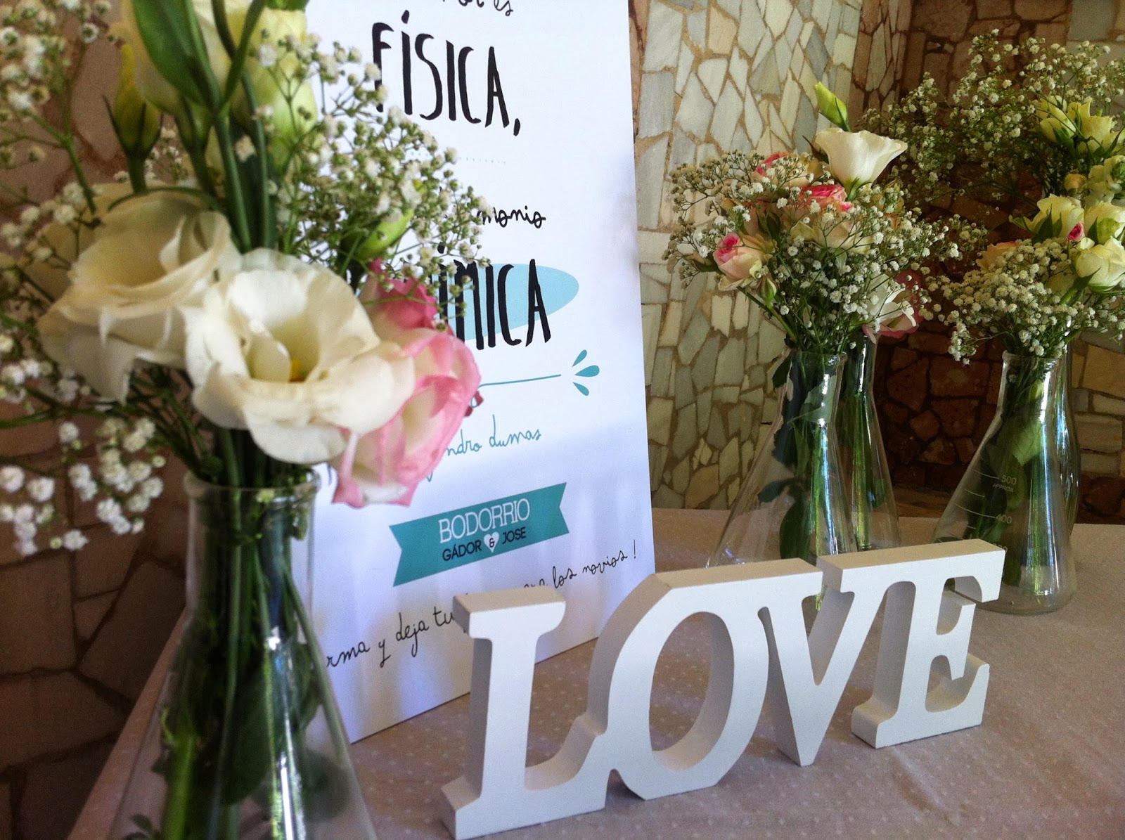 Como os decía en la entrada de ayer, Gádor & Jose tenían claro que querían una boda con estética vintage y muy romántica, y nos pidieron también que pensáramos en algún guiño a la carrera que había estudiado la novia: química. Reconozco que en un primer momento creí que no sería sencillo encajarlo en nuestro diseño decorativo, pero al final ha resultado que el material de laboratorio tiene utilidades en las que nunca antes habría pensado, ¡y que queda bien bonito!.