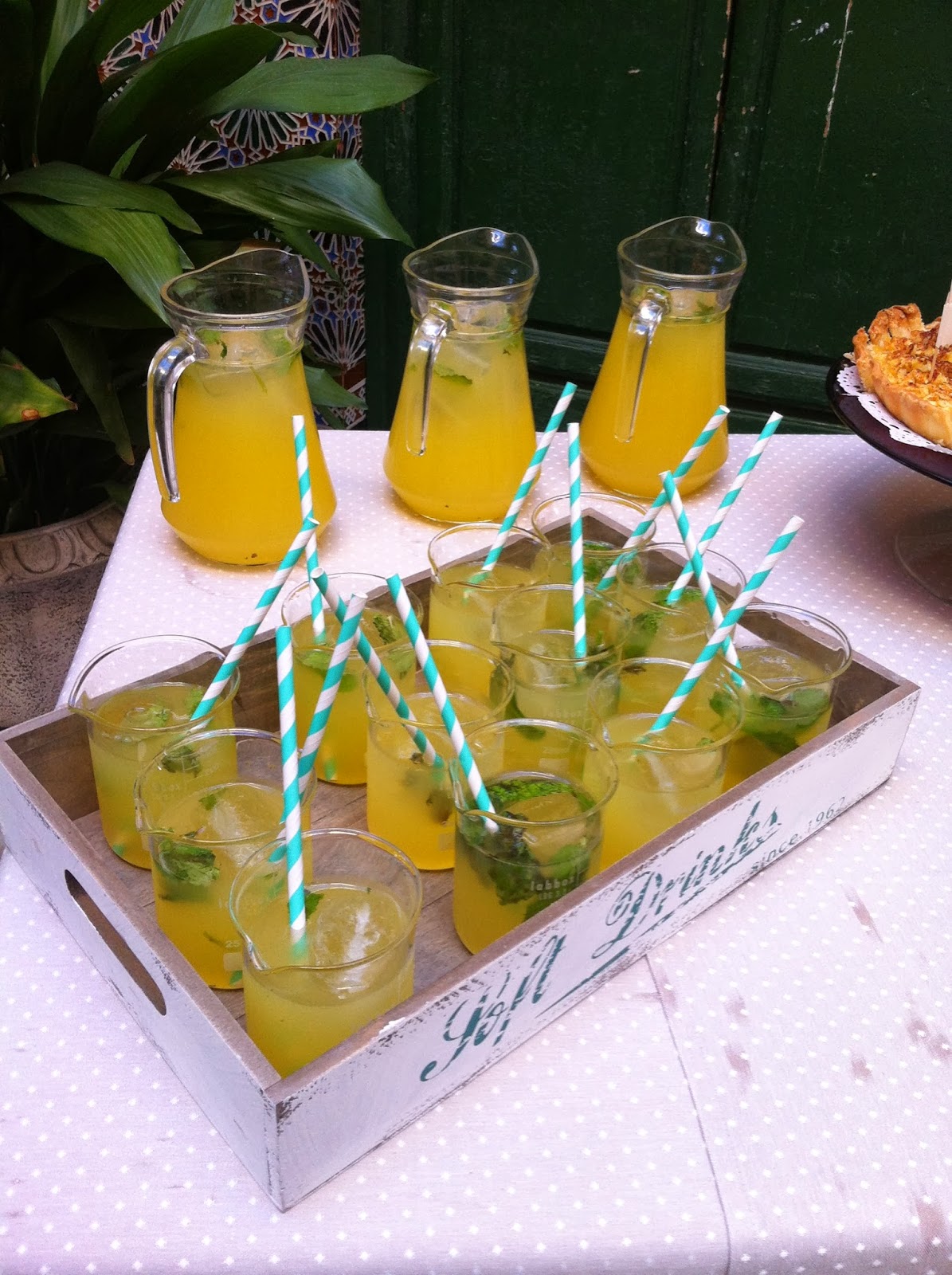 Partiendo de la base de utilizar elementos que tuvieran que ver con la química, se nos ocurrió montar una mesa con limonada para recibir a los invitados; y que la limonada estuviera servida en vasos de precipitado. Además, la novia quería dar como parte de los regalos a los asistentes a su boda la receta de una tarta de manzana espectacular que hace ella; y le propusimos poner un par de tartas (que hizo ella misma) para acompañar la limonada. El resultado fue una mesa muy apetecible de la que ¡no quedo nada!