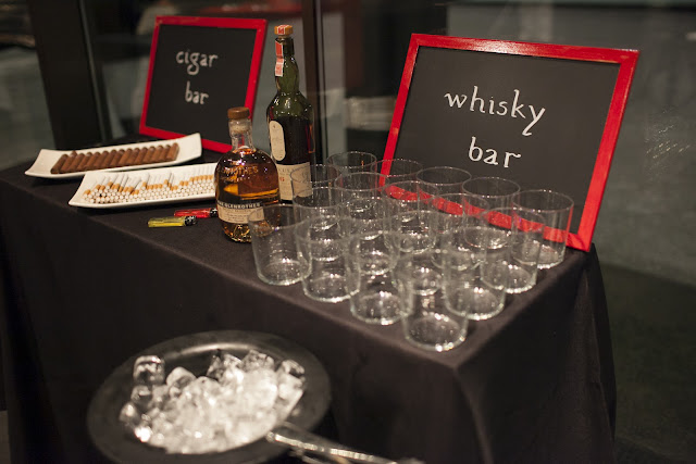 Además, colocamos una mesa en la que había tabaco, puros y whisky. Todo ello señalizado en pizarras con el borde rojo (siguiendo la línea del color de los centros de mesa).