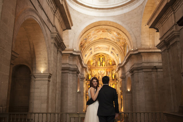 Después del enlace, los novios hicieron un amplio reportaje de fotos por el colegio donde se casaron, y por otras zonas del Monasterio De El Escorial; y aunque a veces parece un poco pesado dedicar una hora el día de tu boda a la sesión fotográfica, hay veces (como en este caso) en que viendo el resultado no puede merecer más la pena.