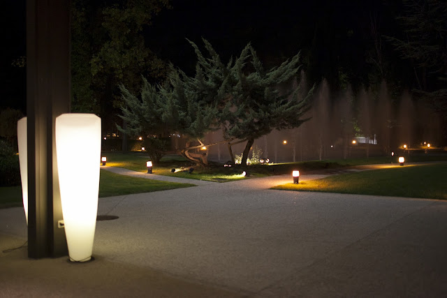 A la entrada colocamos un cartel (podéis verlo aquí) con los nombre de los novios, dando la bienvenida a los invitados. Y por el césped distribuimos más de 30 velas en fanal esféricas que ambientaban la zona exterior del cocktail.