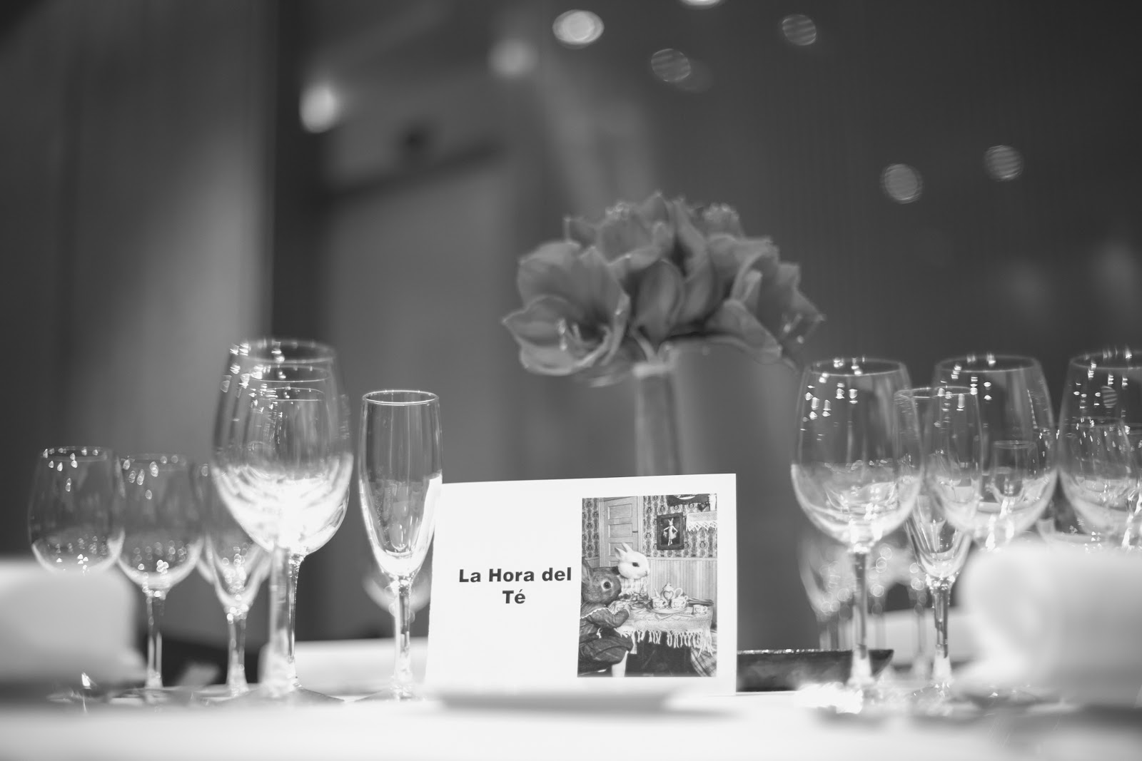 El protocolo de mesas fue una de las cosas más originales de esta boda, y es que al novio se le ocurrió utilizar imágenes de humanos con cabeza de animal, y él mismo le puso nombre a cada mesa inspirándose en cada imagen y en los invitados que iban a estar sentados en cada una de ellas (la de los novios de llamaba “Los Amantes”).