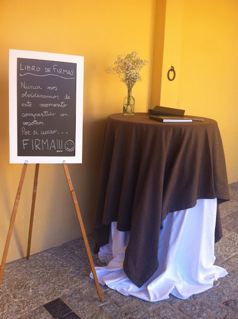El libro de firmas lo colocamos en una mesa alta tipo velador, en la que colocamos un sencillo arreglo floral con paniculata. Al lado pusimos una pizarra con una frase que invitaba a que los asistentes dejaran un recuerdo a los novios en forma de dedicatoria.