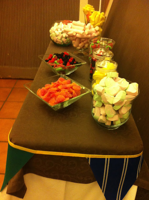 Para la zona de la discoteca colocamos una barra de chucherías con unos banderines en tonos sobrios, que iban acordes con el resto de decoración del salón y con la personalidad de nuestros clientes.