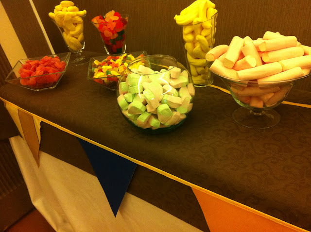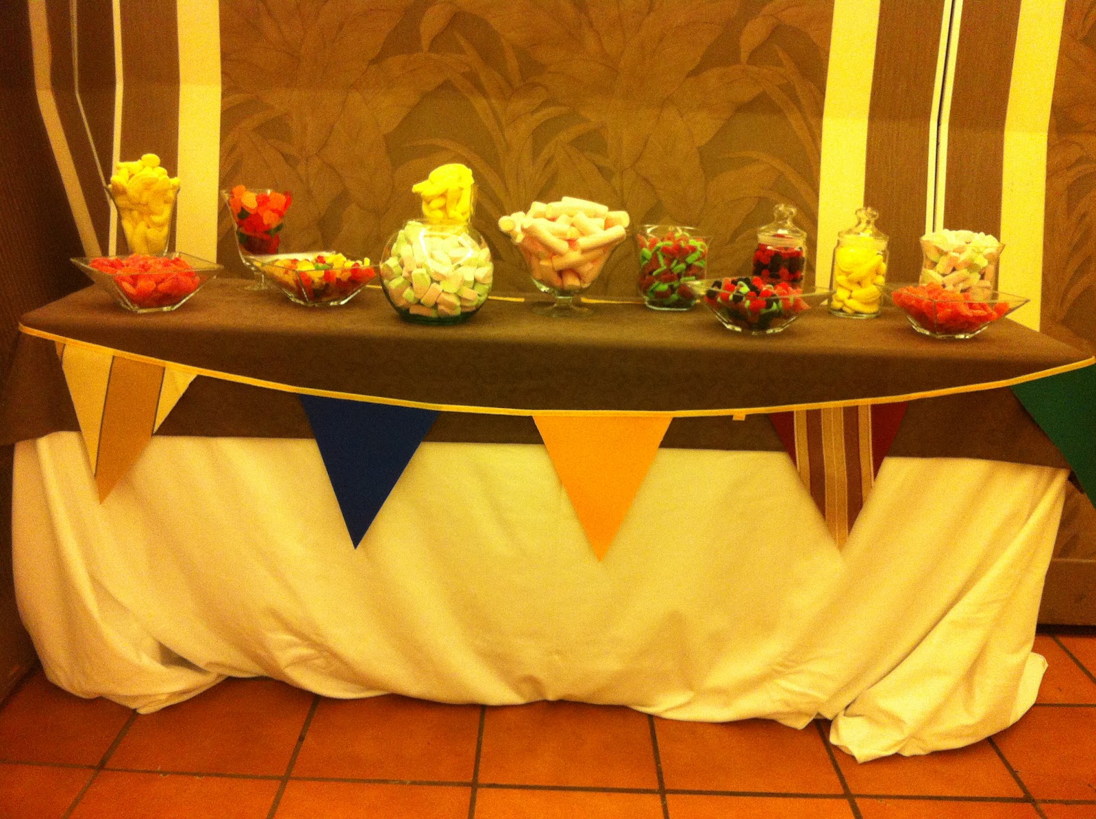 Para la zona de la discoteca colocamos una barra de chucherías con unos banderines en tonos sobrios, que iban acordes con el resto de decoración del salón y con la personalidad de nuestros clientes.