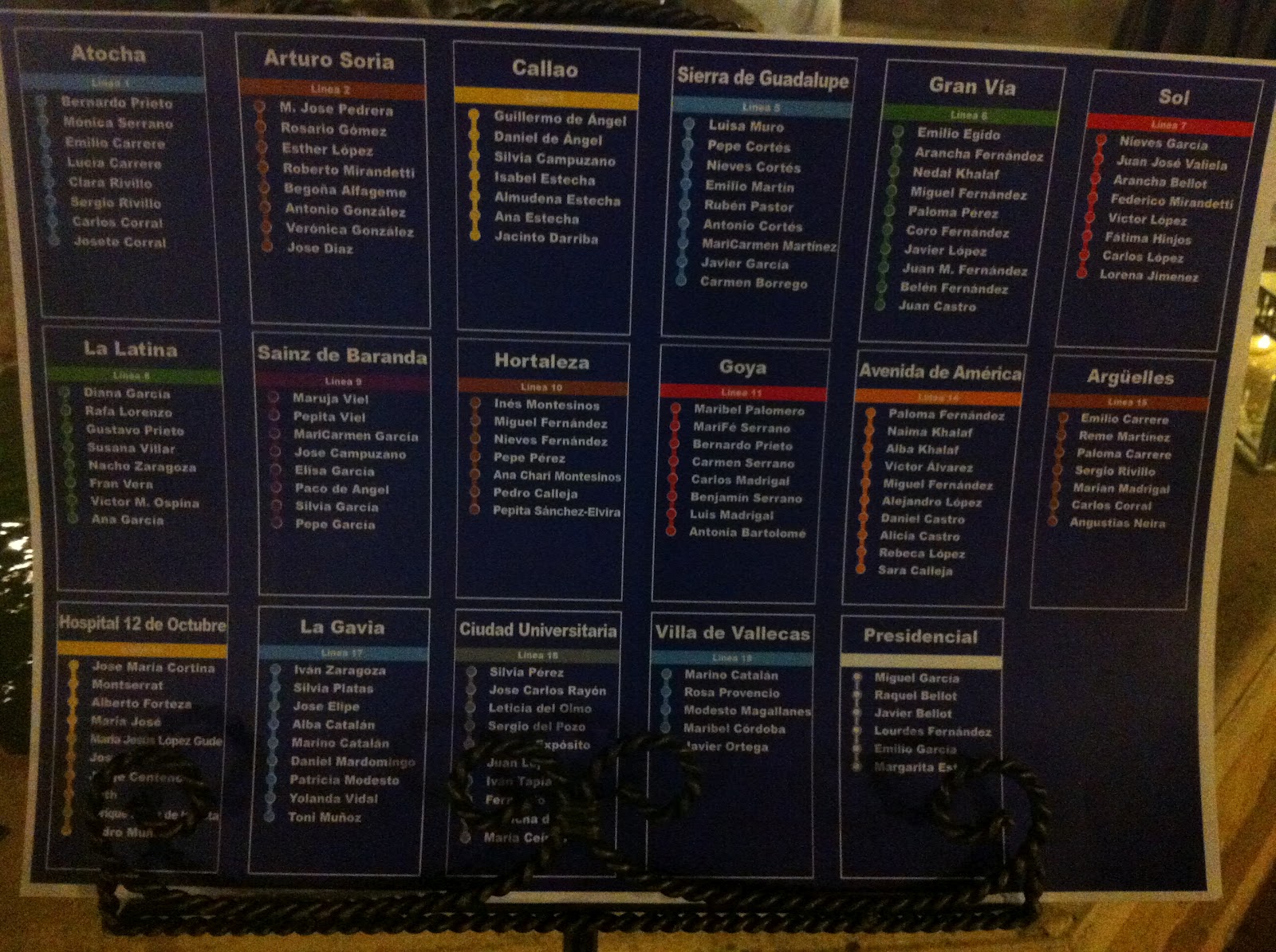 Queríamos que los meseros y el protocolo de mesas fueran originales, y al novio se le ocurrió que cada mesa fuera una estación del metro de Madrid. Y la verdad es que el resultado fue estupendo; además los novios colocaron a sus invitados en estaciones que tenían relación con sus vidas (por ejemplo las amigas de la carrera de la novia en Ciudad Universitaria).
