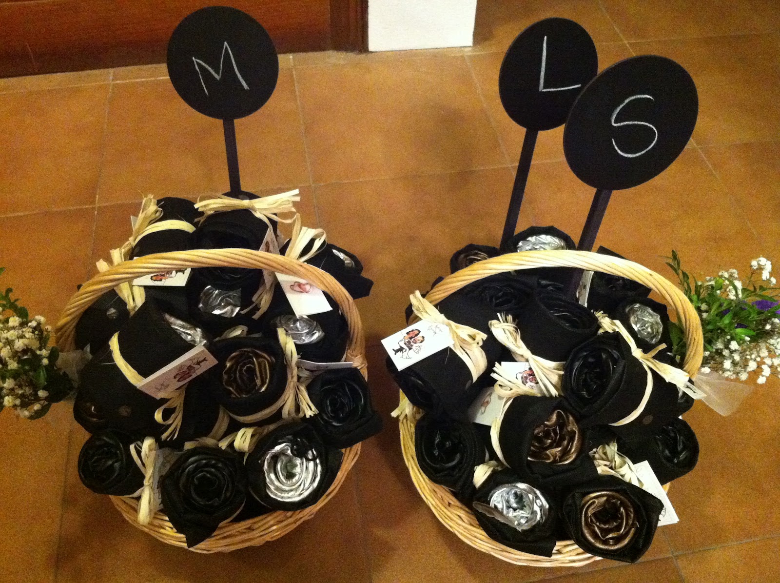 Para las mujeres se repartieron pashminas, y bailarinas enrrolladas para que pudieran liberarse de los tacones una vez finalizada la cena. Ya que las cestas las preparamos en Something Blue, Wedding Planner Madrid reutilizamos los ramilletes de las sillas de la ceremonia para adornarlas y que estuvieran más bonitas a la hora de repartir los regalos. Para indicar las tallas de las bailarinas utilizamos unos letreros de pizarra, en línea con otros elementos de decoración de la boda.
