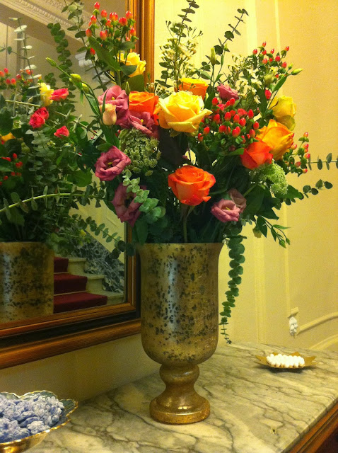 En el hall del Centro Riojano montamos un bodegón con candelabros dorados, un gran arreglo floral en un jarrón en tono dorado envejecido, y varios recipientes con violetas (que son caramelos típicos de Madrid). Todo muy en la línea estética del lugar donde se celebraba la boda, y acorde también al gusto de los novios. La floristería que montó todos los arreglos del evento es La Galería de Doña Urraca, y el resultado fue simplemente perfecto.