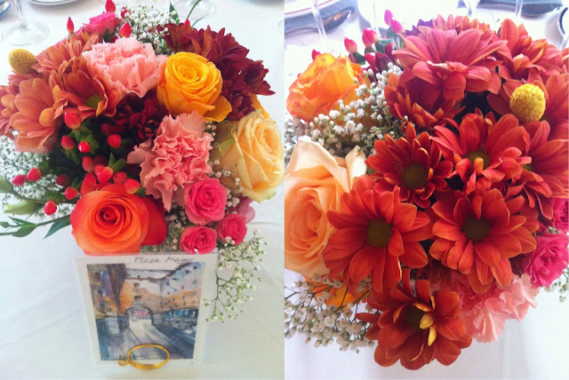 Las mesas del banquete tenían nombres de lugares emblemáticos de la ciudad, los meseros eran acuarelas pintadas para la ocasión por un familiar de la novia, y los centros de flor llevaban los colores de la decoración general, y flores bastantes variadas consiguiendo un efecto romántico pero muy actual.