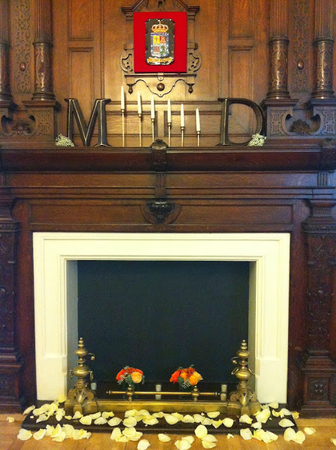 El área donde se dio el cocktail de la boda estaba presidida por una chimenea, que también quisimos personalizar con las iniciales de los novios, más velas, y flor y pétalos en la zona de abajo.