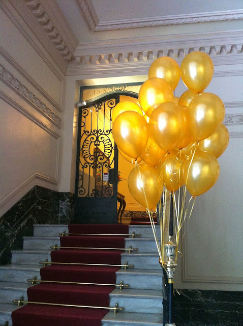 Toda la decoración de la boda estuvo basada en los colores dorado y tangerine tango. En las escaleras de acceso colocamos unos globos dorados, dando la bienvenida a los invitados. Además, se nos ocurrió que los globos serían un elemento perfecto para acompañar a los novios en su reportaje fotográfico como recién casados por el parque de El Retiro, y por lo que me han dicho Alma Fotografía y Lluch&Soler (los encargados de documentar gráficamente este enlace), los globos dieron mucho de sí y estoy deseando ver el resultado de estas imágenes tan especiales.