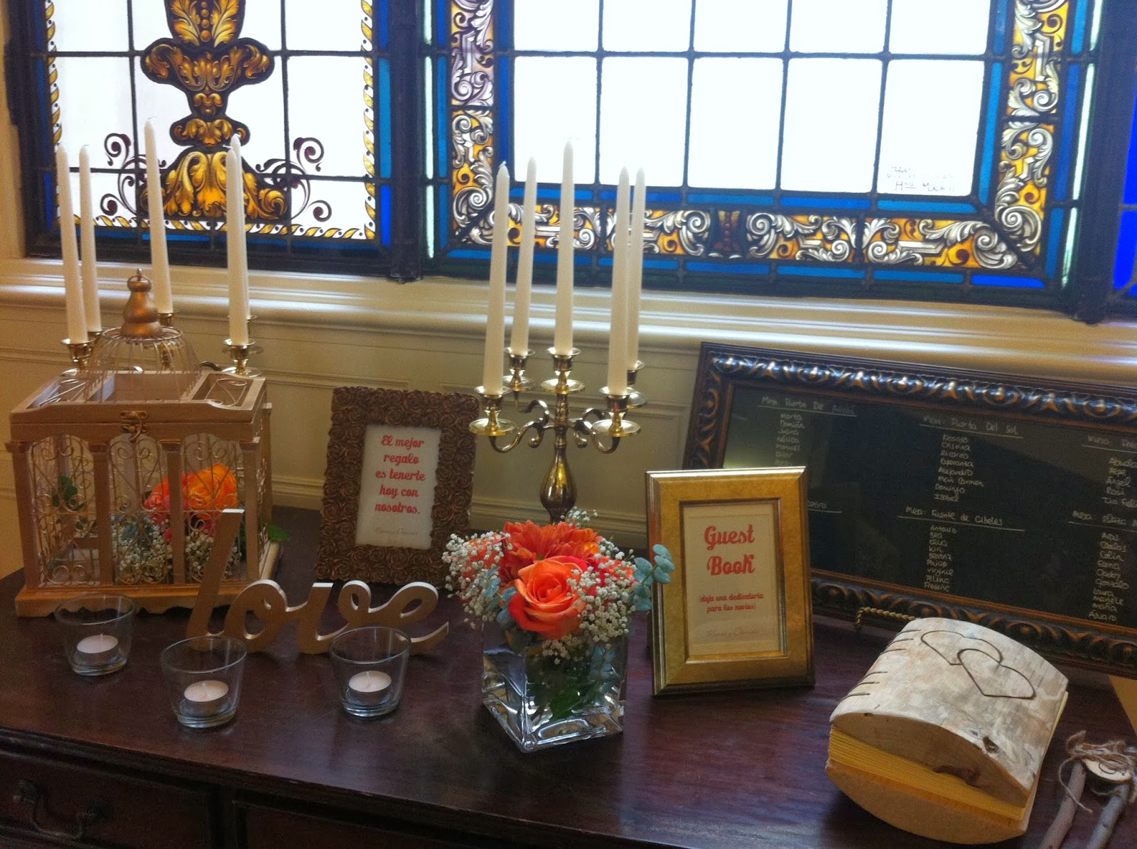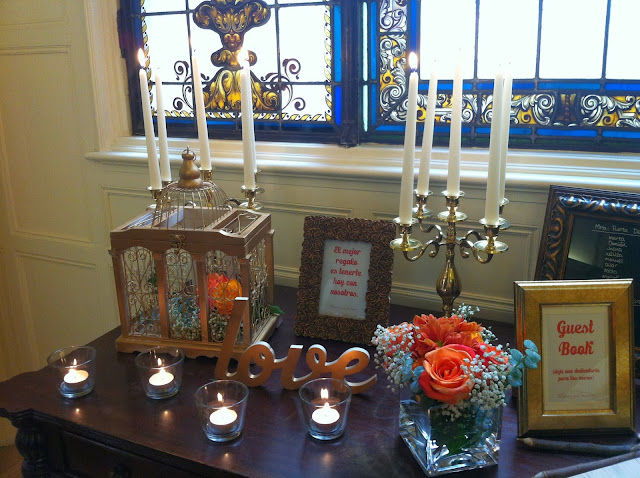 En la zona del cocktail pusimos un corner con el libro de firmas de la boda, y con el seating de invitados. Además, la jaula tenía como objetivo que aquellos invitados que querían dar el regalo a los novios en un sobre el día de la boda, pudieran dejarlo allí (esto es una costumbre en las bodas celebradas en America Latina y USA). Todo ello acompañado de un arreglo floral en la línea de color del resto de la boda, y un par de preciosos candelabros.