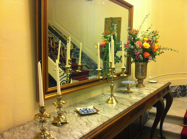 En el hall del Centro Riojano montamos un bodegón con candelabros dorados, un gran arreglo floral en un jarrón en tono dorado envejecido, y varios recipientes con violetas (que son caramelos típicos de Madrid). Todo muy en la línea estética del lugar donde se celebraba la boda, y acorde también al gusto de los novios. La floristería que montó todos los arreglos del evento es La Galería de Doña Urraca, y el resultado fue simplemente perfecto.