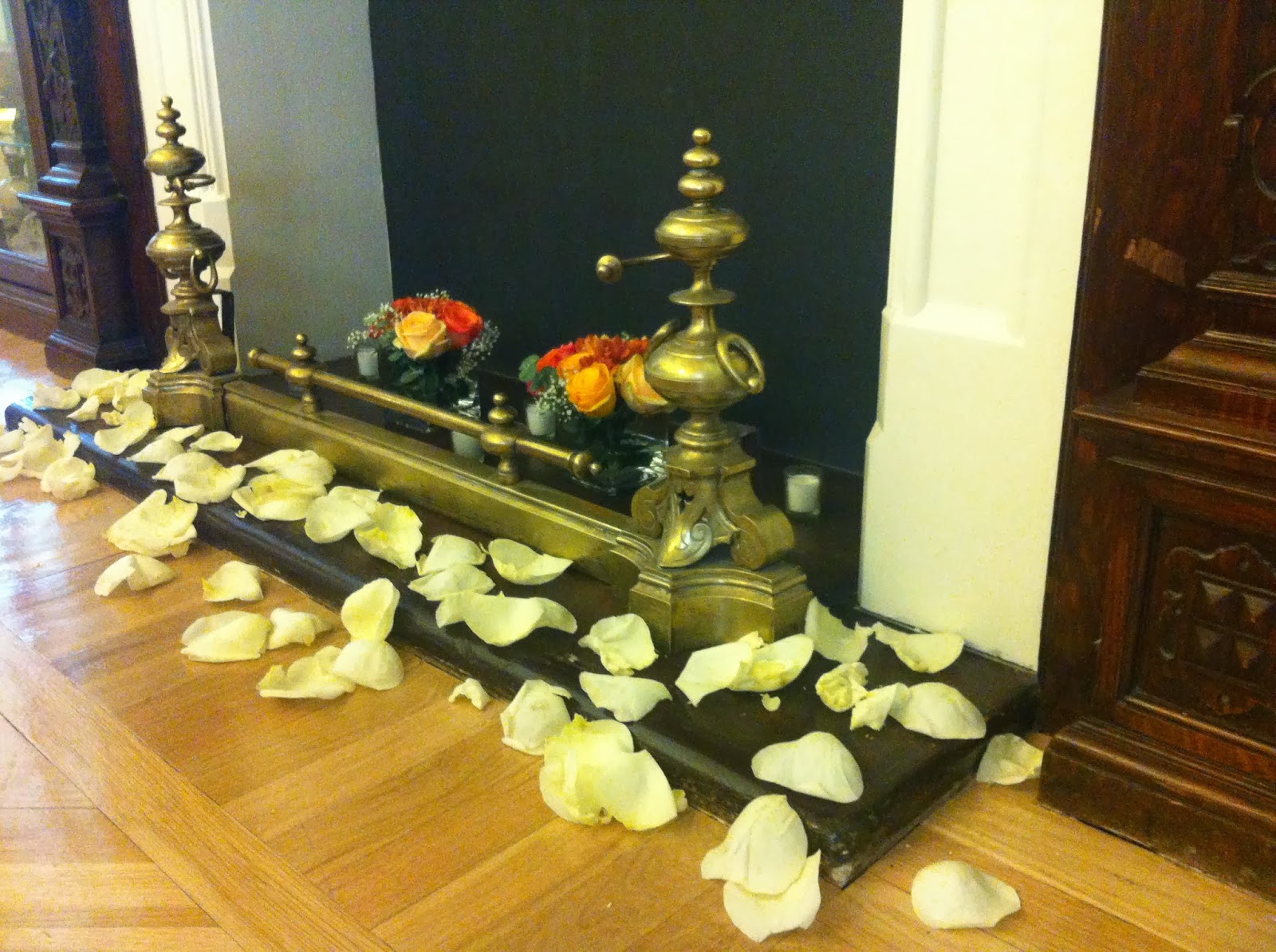 El área donde se dio el cocktail de la boda estaba presidida por una chimenea, que también quisimos personalizar con las iniciales de los novios, más velas, y flor y pétalos en la zona de abajo.