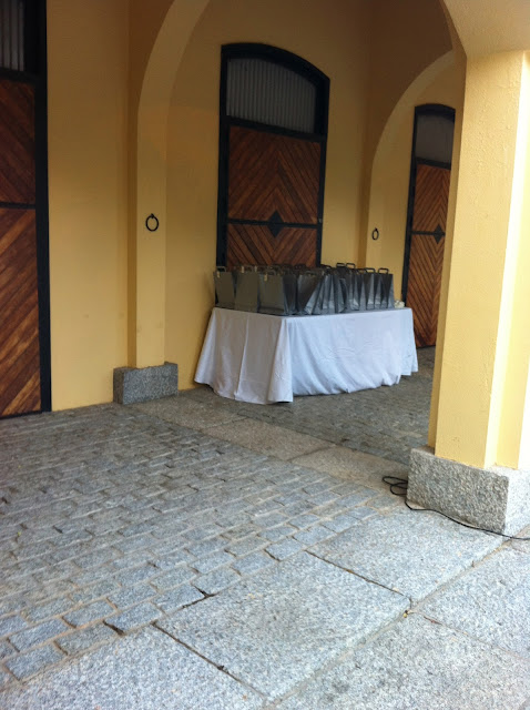 En la zona de detrás de las mesas de la cena instalamos una mesa de apoyo sobre la cual colocamos los regalitos para las invitadas.