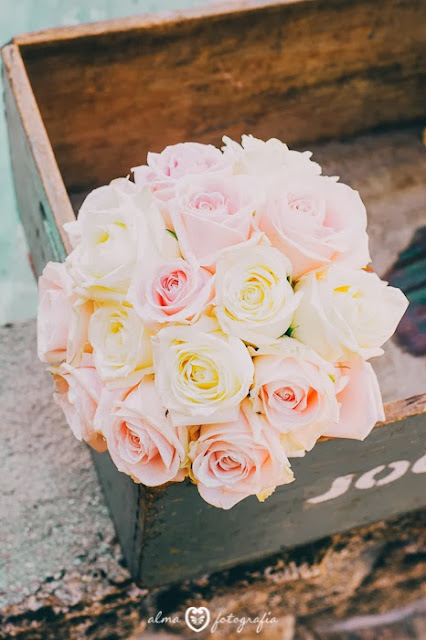 La novia tenía claro que quería un estilismo muy dulce, y acorde con el romántico vestido que iba a llevar. Así que, además de comprar en Italia -donde reside- unos espectaculares Valentino, lució una rosa del mismo tono en el recogido, y encargamos para ella un ramo con rosas en color rosa palo y crema.