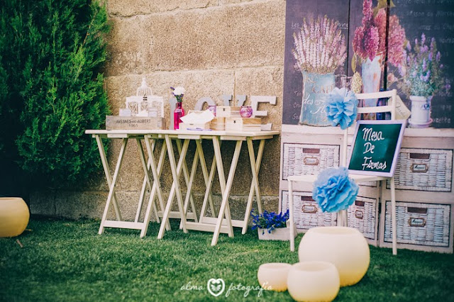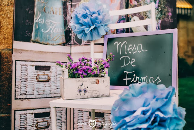 Ahora algunas fotos de los detalles de decoración que pusimos en esta boda, la pizarra dando la bienvenida a los invitados, la maleta con conos con pétalos en la zona de la ceremonia (está vacía porque la foto se hizo después del Sí Quiero), y el bodegón de la mesa de firmas.
