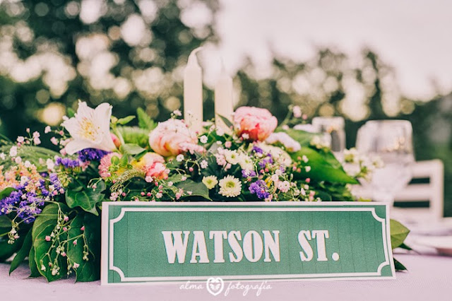 Los centros de mesa los encargamos con flor muy campestre, ya que el entorno en el que se realizaba la celebración daba pie a utilizar este tipo de arreglos; y en la mesa de los novios (cada mesa era una calle donde habían vivido ellos o sus familiares más cercanos) colocamos también un jarrón con flores del jardín de los padres de la novia, algo que fue una sorpresa para ella.