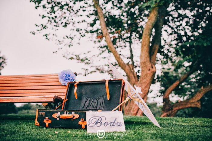 Ahora algunas fotos de los detalles de decoración que pusimos en esta boda, la pizarra dando la bienvenida a los invitados, la maleta con conos con pétalos en la zona de la ceremonia (está vacía porque la foto se hizo después del Sí Quiero), y el bodegón de la mesa de firmas.