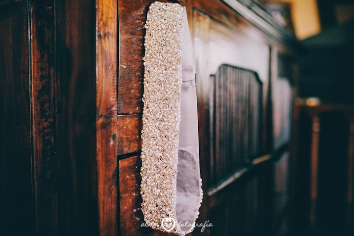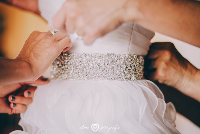 De nuevo comenzamos con imágenes de los preparativos de la guapísima Marimer. Cuando eligió su vestido de Aire Barcelona tuvimos claro que había que completarlo con un cinturón para marcar la transición del cuerpo del vestido a la falda; le ayudamos a encontrarlo, y el resultado final de su look no pudo ser más perfecto.