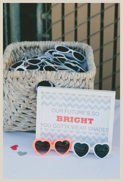 Los detalles que se regalan a los invitados deben ser algo que sea útil, al menos el día de la boda. Así que la posibilidad de dar gafas de sol a los asistentes para que se protejan del sol ese día y se hagan fotos de grupo divertidas es muy recomendable, y es algo que no está nada visto. Si además lo acompañáis de un cartelito con un mensaje tan genial como el de esta imagen el resultado será perfecto (pone que el futuro de los novios es tan brillante que recomiendan usar gafas).