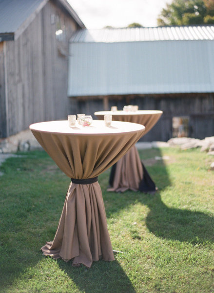 Y para terminar, un tip muy muy sencillo, que nos va a permitir personalizar un poquito más el espacio que utilicemos para dar el cocktail en la boda. Siempre se utilizan mesas altas -veladores- para esta parte del servicio de catering, y lo más habitual es que lleven un mantel del color que hayan elegido los novios, o el que ofrezca el hotel/finca/restaurante. Pues bien, si ese mantel lo recogemos con una cinta de otro color conseguiremos que el efecto visual de la mesa cambie totalmente, y además así podemos jugar con la línea de color que hayamos elegido para toda la boda sin necesidad de modificar toda la mantelería que nos ofrezca el espacio de celebración.