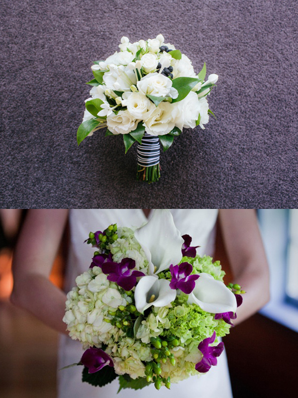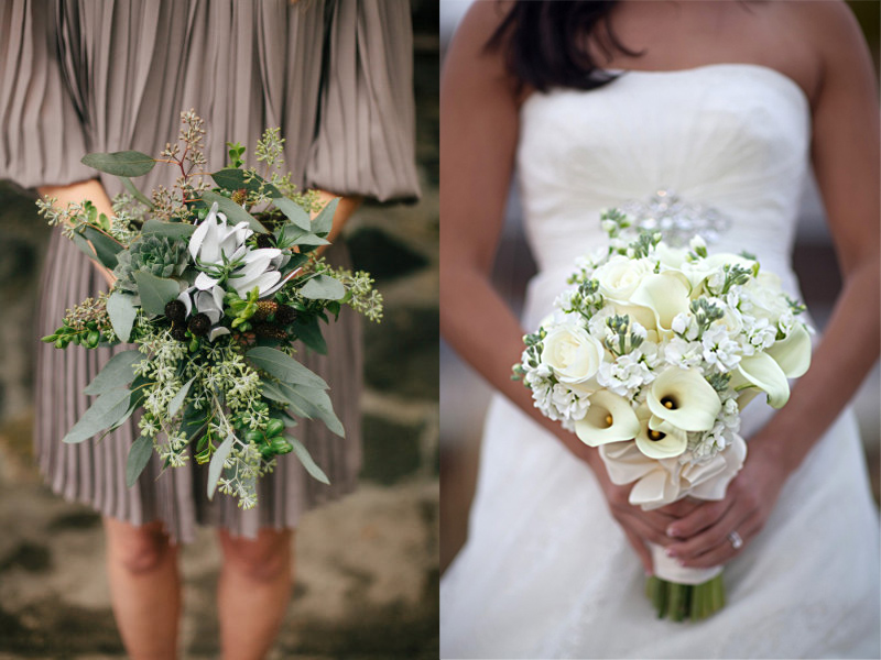 Los que os muestro a continuación son más sobrios, aunque en ambos casos el concepto es actual; en el de arriba también por llevar una empuñadura diferente cubriendo el tallo (como veis esto puede dar mucho juego si queréis hacer algún guiño a un estampado en vuestro ramo), y en el de abajo por llevar hortensias en tonos verdes, que es una flor no muy habitual en ramos de novia -aunque sí en arreglos florales para la decoración de bodas-.