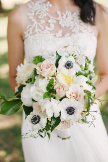 El siguiente me ha gustado mucho, lleva una de las flores que más de moda están en ramos de novia: la anémona; pero combinada con rosas en tonos pasteles que dulcifican y hacen más clásico el conjunto.