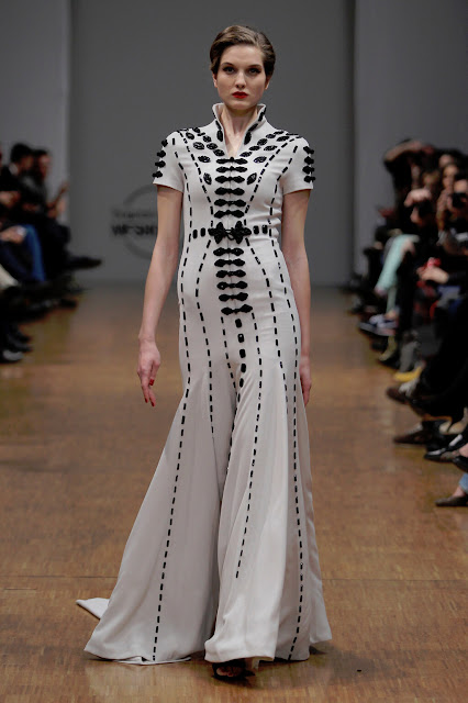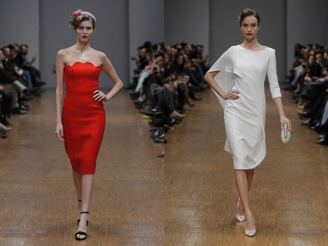Los diseños que presentaron tenían un marcado aire años 50, con líneas sobrias y cortes muy favorecedores. Los colores de esta colección son totalmente otoñales, con importante presencia de los tonos rojos, tierra, negro. También presentaron varios modelos en color blanco, entre los que se encuentra el que más me gustó a mi: este vestido corto, asimétrico en su parte superior que os muestro a continuación.