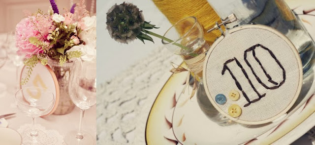Para enlaces con estilo DIY y aire romántico y vintage un pequeño bastidor con el número bordado, apoyado sobre el centro de la mesa, puede ser una opción perfecta.