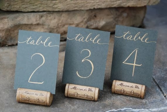 Una versión low cost sera utilizar corchos de botellas de vino con una ranura en su parte superior para colocar sobre ellos los números de las mesas; quedan muy bonitos y son realmente originales, pero cuidado con usarlos en montajes en exterior, en cuanto haya un poquito de aire se nos pueden venir abajo (aunque usemos cinta de doble cara para mantenerlos en pie).