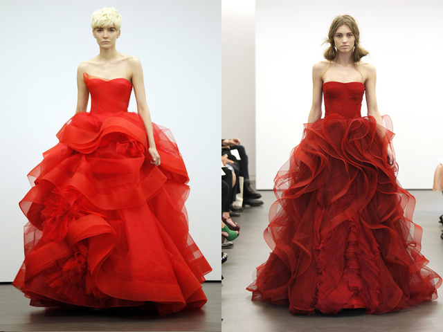 Vera Wang, que en la última edición de la pasarela sorprendió con trajes en color negro, ha optado en este caso por una colección al 100% en tonos rojizos. Los diseños me gustan, pero el color a mi se me hace una apuesta demasiado arriesgada, y muy poco favorecedor.