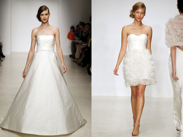 Las propuestas que más me han gustado para la próxima temporada de bodas 2013 han sido las de Amsale, que mezcla líneas clásicas, con vestidos cortos; y diseños con corte imperio y faldas con caídas muy favorecedoras.
