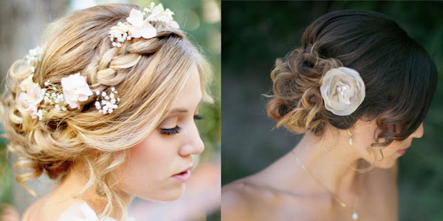 Y termino con dos opciones que son bastante similares en cuanto al resultado que consiguen. Son recogidos bajos hechos con bucles en la parte final de la melena, que además no van muy pegados a la cabeza y en conjunto quedan románticos, dulces, juveniles; y si le metemos mucha flor como en el primer caso, el conjunto es perfecto para una boda en el campo por ejemplo.