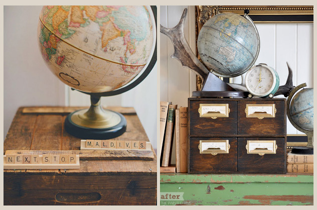El primer elemento que os quiero proponer para dar un punto diferente a esos bodegones con aire vintage que tanto se montan en las bodas es una bola del mundo. Parece una tontería, pero por algún motivo este elemento tiene un punto retro que me encanta, y encaja genial combinado con madera tratada con barniz para dar efecto envejecido.
