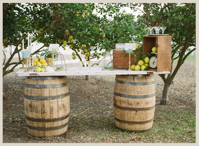 La otra idea que os quiero proponer es utilizar barriles de madera, o bien a modo de mesas velador en el cocktail, o como elemento de apoyo en los puntos de decoración en la boda. Da un aire súper rústico y especial al ambiente, ¿no os parece?